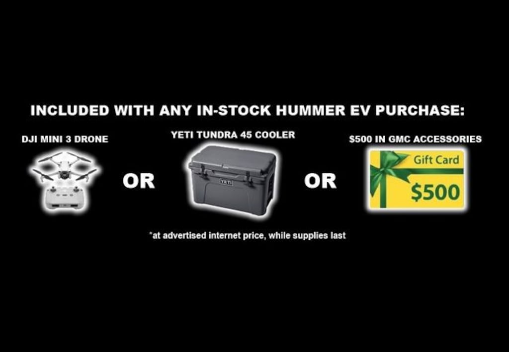 Any purchase of an in-stock Hummer EV at CMA's Colonial Auto Center comes with a free gift of a Yeti Tundra 45 cooler or $500 in GMC accessories!
